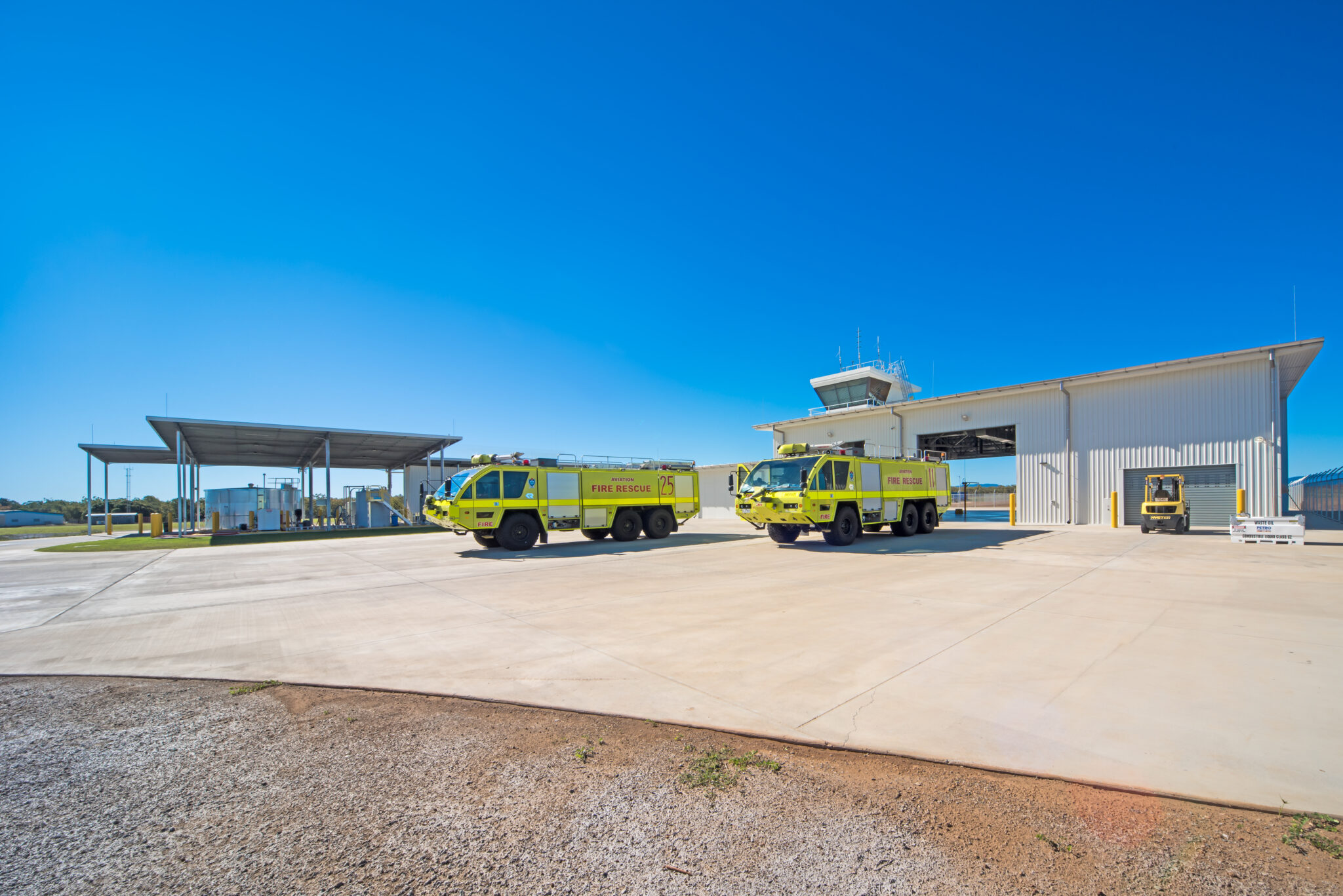 The building was constructed with structural steel and CFC cladding and consists of a gym, office space, kitchen and amenities. The civil works included 8000m² of concrete pavement and 8000m² of asphalt, with one pavement being an emergency driveway that connects directly to the landing strip. The facility is a Class 4 building designed as a drive-through and to handle 8 x 8 fire trucks, with each axle weighing 14.1 tonnes. The existing water and sewer services were also redesigned to facilitate on-site treatment, as they were initially located more than 400m from the project site.